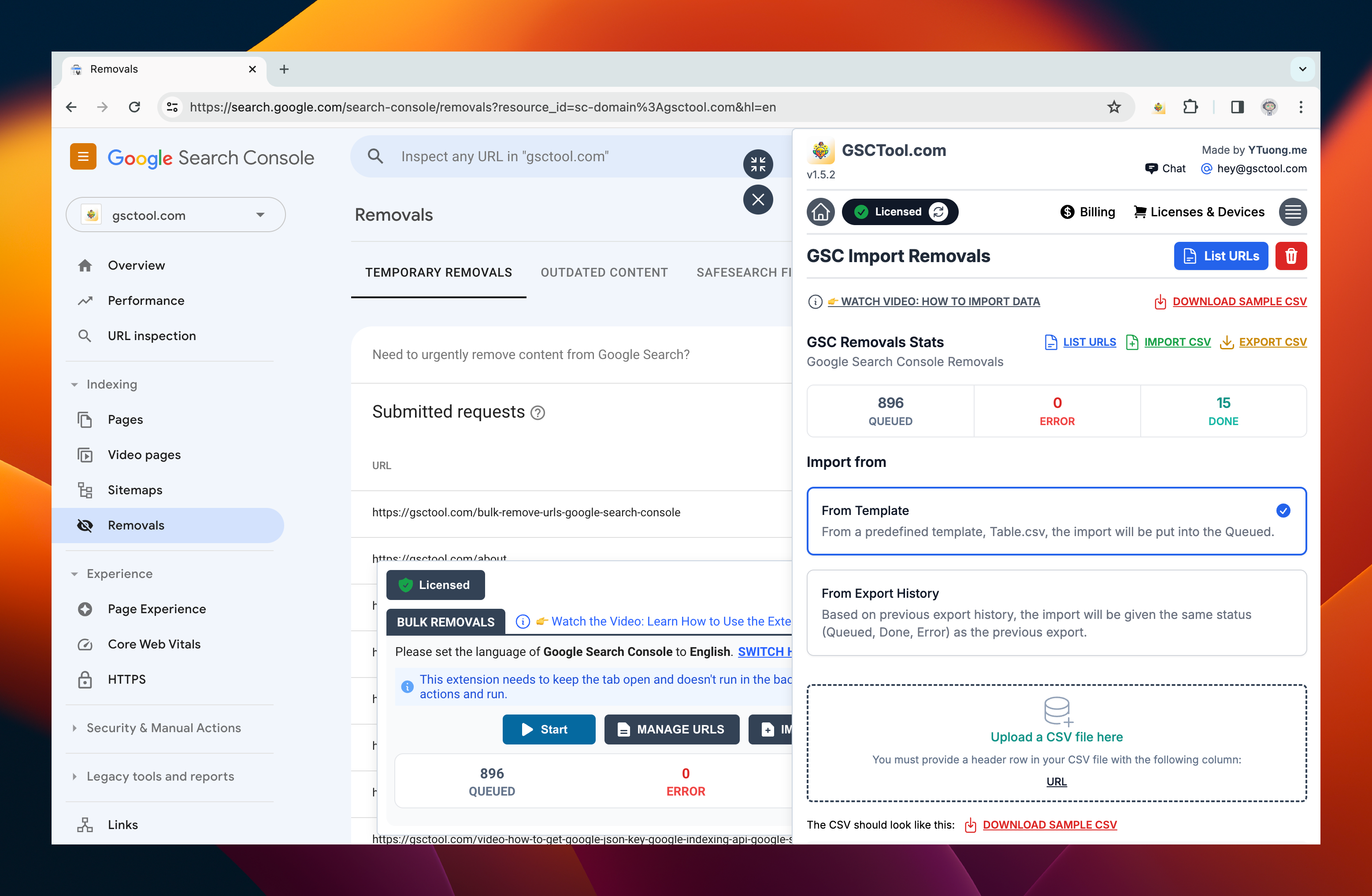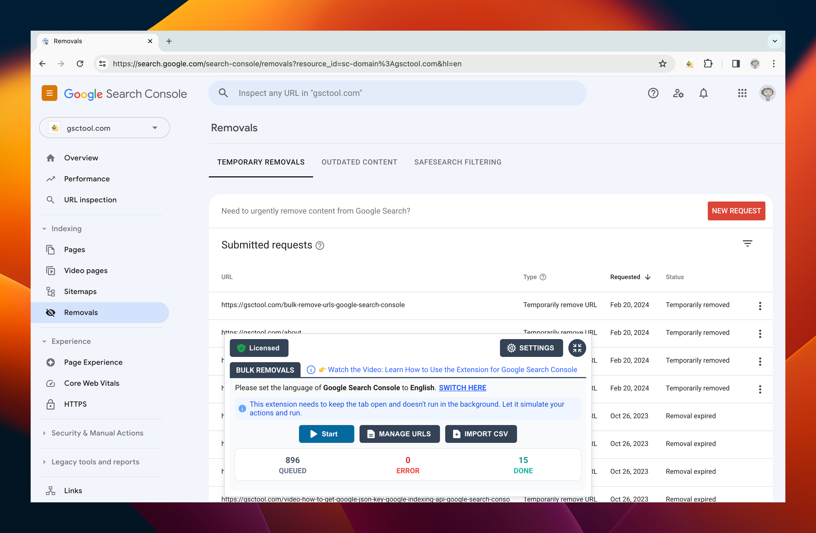 A: First, upload your CSV file under "Manage URLs". Then, return to the "Removals" page, refresh, and click on "Start".